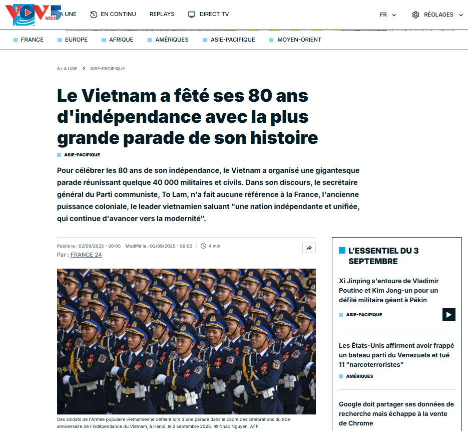 El canal France 24 informa sobre el desfile celebrado en Vietnam con motivo del 80.º aniversario de la Independencia. (Foto: VOV) |