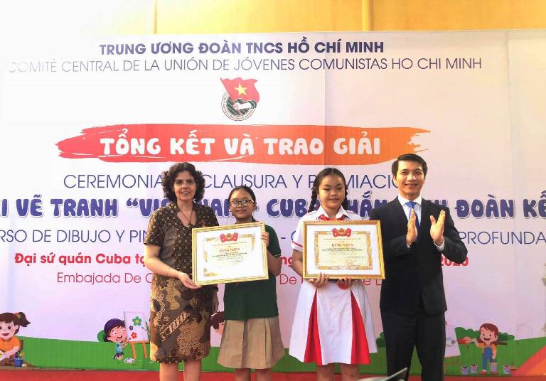 La embajadora cubana Lianys Torres Rivera y el secretario de la Unión de Jóvenes Comunistas Ho Chi Minh, Nguyen Ngoc Luong, otorgan certificados de reconocimiento a los niños ganadores del primer premio del concurso (Foto: doanthanhnien.vn) |