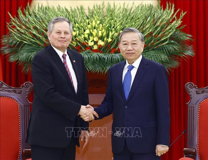El secretario general del Partido Comunista de Vietnam, To Lam, y el senador estadounidense Steve Daines. (Foto: VNA) |