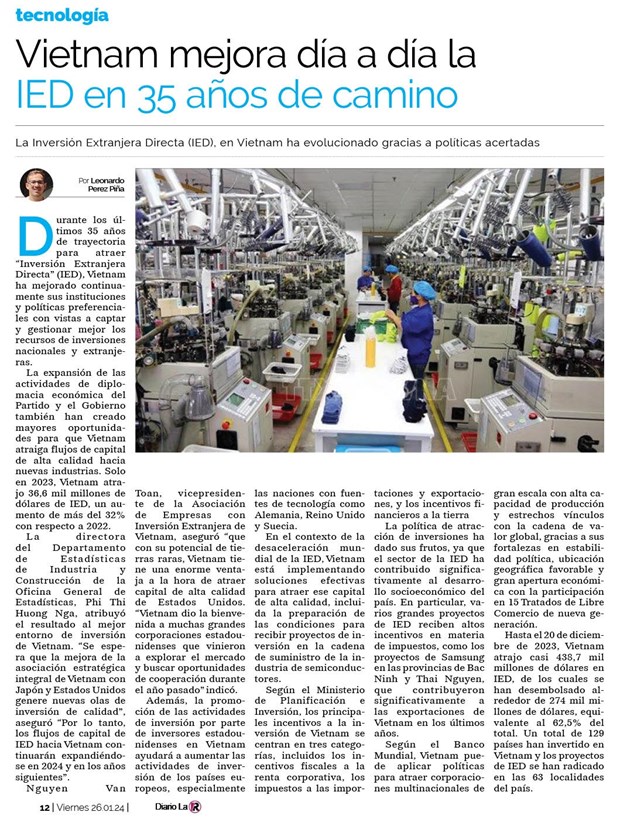 En otro artículo escrito por el mismo autor uruguayo bajo el título “Vietnam mejora día a día la IED en 35 años de camino”, se destacó que la Inversión Extranjera Directa (IED) en Vietnam ha evolucionado gracias a políticas acertadas.