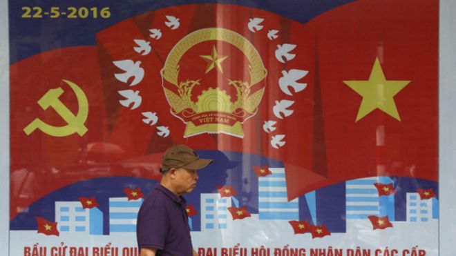 ![]() Un vietnamita pasa delante de una pancarta sobre las elecciones generales
