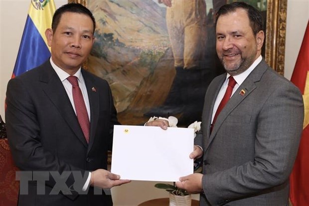 El canciller de Venezuela, Yván Gil Pinto (d) y el embajador vietnamita Pham Trung My en el acto de recepción de la copia de cartas credenciales. (Foto: VNA) |