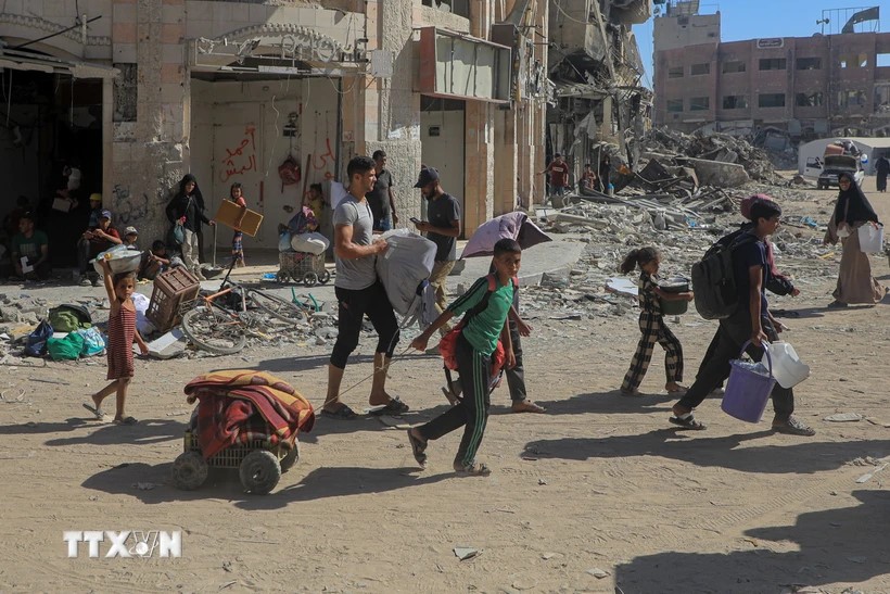Palestinos de la ciudad de Khan Younis se ven obligados a evacuar, el 8 de agosto de 2024. (Foto: Xinhua/VNA) |