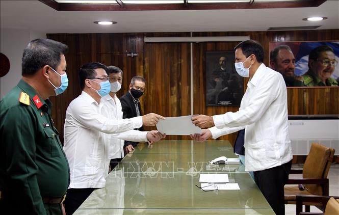 El embajador vietnamita en La Habana, Le Thanh Tung, entrega el mensaje de felicitación del PCV al subjefe del Departamento de Relaciones Internacionales del Partido Comunista de Cuba, Juan Carlos Marsán Aguilera. (Foto: VNA) |