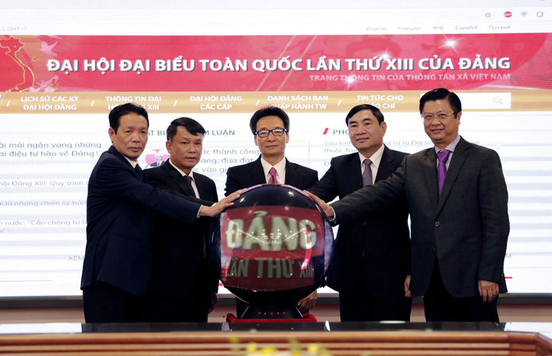 El viceprimer ministro Vu Duc Dam (m) y otros delegados al acto de inauguración del sitio web especial al servicio del XIII Congreso Nacional del Partido Comunista de Vietnam (Foto: VGP) |
