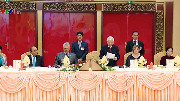 En la recepción, el máximo líder político de Vietnam dio la bienvenida al dirigente cubano y apreció su permanencia en el territorio nacional que contribuye a consolidar la amistad especial y la solidaridad fiel entre ambos pueblos. En idéntico sentido, Nguyen Phu Trong afirmó: “En septiembre de 2018, Vietnam y Cuba celebraron numerosas actividades conmemorativas del 45 aniversario de la visita de Fidel Alejandro Castro Ruz, el único líder extranjero que fue a la zona recién liberada de Vietnam del Sur en 1973. Hoy en día, las relaciones bilaterales son como oro refinado por el fuego. Vietnam sigue de cerca y acompaña al pueblo hermano en su causa revolucionaria, considerando los logros de Cuba como su propia alegría y compartiendo las dificultades que enfrenta”.