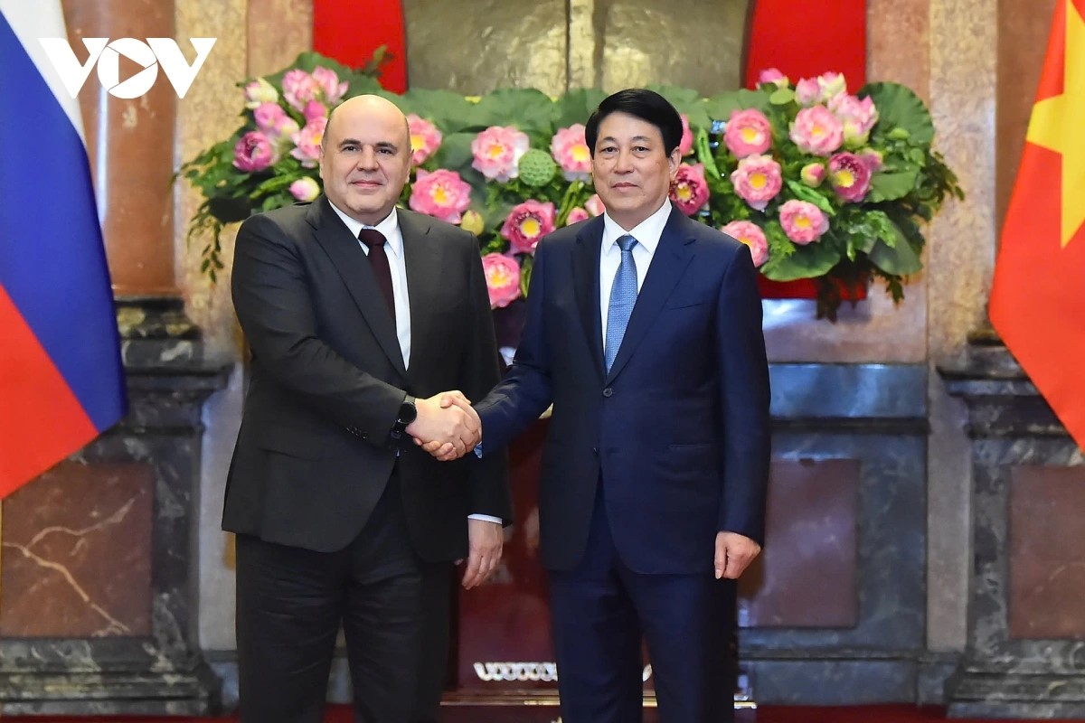 El presidente de Vietnam, Luong Cuong (d), y el primer ministro ruso, Mijail Mishustin. |