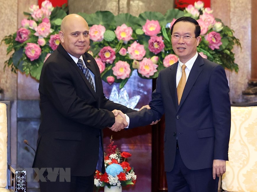 El presidente de Vietnam, Vo Van Thuong, y el miembro del Buró Político y secretario de Organización del Comité Central del Partido Comunista de Cuba, Roberto Morales Ojeda. (Foto: VNA) |