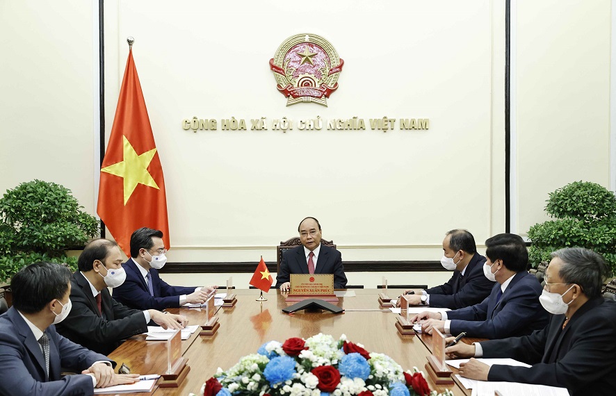 El presidente vietnamita, Nguyen Xuan Phuc (c.), en la conversación telefónica con el primer secretario del Comité Central del Partido Comunista y presidente de Cuba, Miguel Díaz-Canel Bermúdez. (Foto: Ministerio de Relaciones Exteriores) |