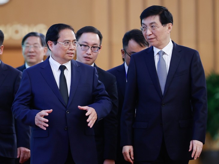 El primer ministro Pham Minh Chinh (i) y Wang Huning, miembro del Comité Permanente del Buró Político del Comité Central del Partido Comunista de China, presidente del Comité Nacional de la Conferencia Consultiva Política del Pueblo Chino y enviado especial del líder del Partido y presidente de China, Xi Jinping. (Foto: VGP) |