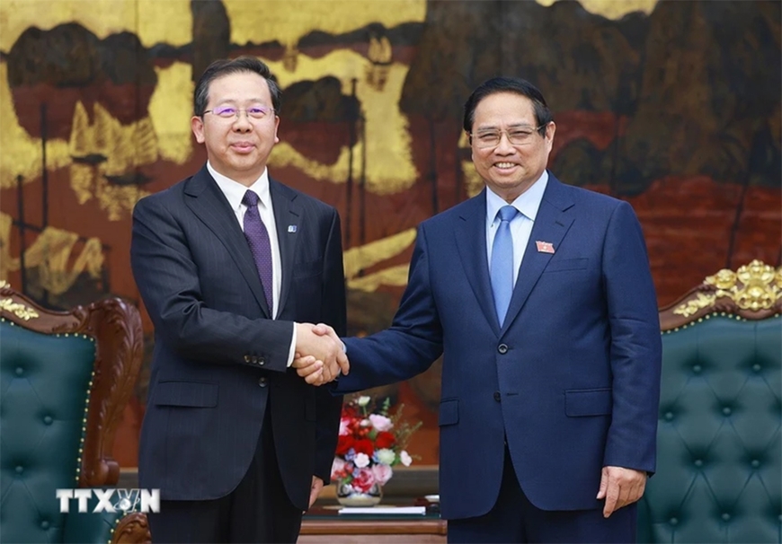 El primer ministro Pham Minh Chinh (d) recibe a Peng Cangping, presidente del grupo chino Hua Dian. (Foto: VNA) |