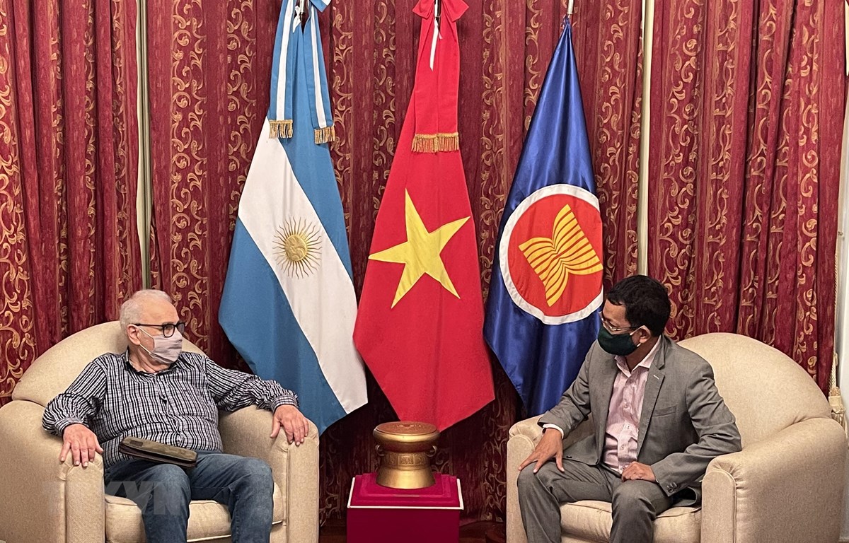 El nuevo embajador de Vietnam en Buenos Aires, Duong Quoc Thanh (d), y el secretario general del Partido Comunista de Argentina (PCA), Víctor Gorodeki Kot (Foto: VNA) |