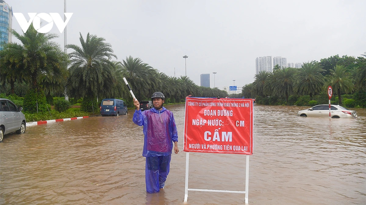 Fuerzas competentes están presentes en los lugares vulnerables para alertar a la población sobre los puntos de inundación en Hanói. (Foto: VOV) |