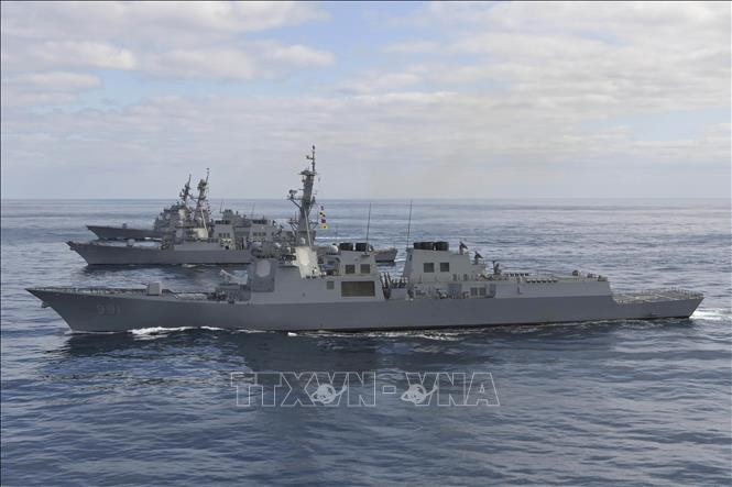 El JS Atago de la Fuerza de Autodefensa Marítima japonesa (lejos), el destructor estadounidense USS Barry (centro) y el destructor surcoreano Sejong le Grand en unos ejercicios de defensa antimisiles en el mar al este de la isla de Ulleung, en Corea del Sur, el 22 de febrero. 2023. (Foto: YONHAP/VNA) |