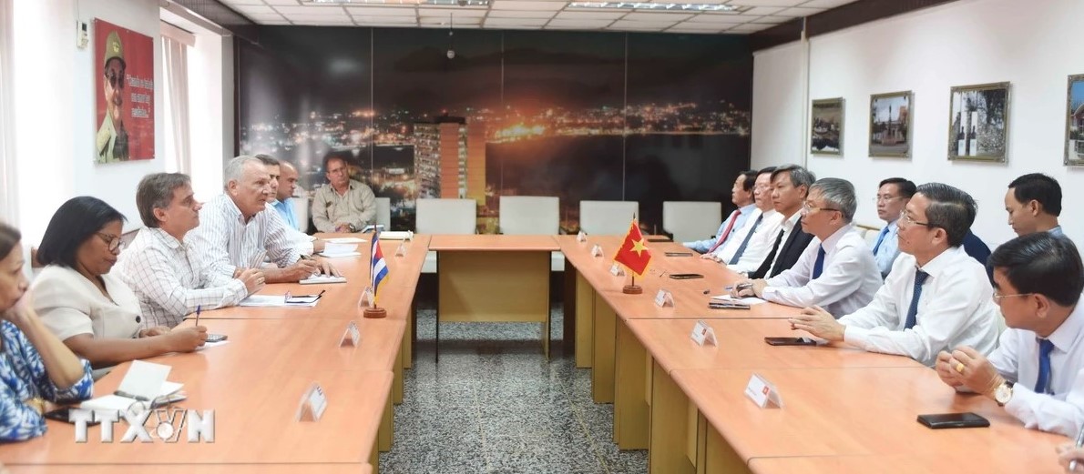 La sesión de trabajo entre la delegación de Quang Nam y el primer secretario del Comité Provincial del Partido de Matanzas, Mario Sabines Lorenzo. (Foto: VNA) |