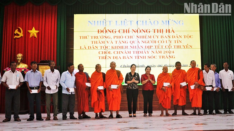 En esta ocasión, Nong Thi Ha entregó 100 obsequios a venerables monjes y personas prestigiosas de los distritos de Chau Thanh, My Tu y Ke Sach.