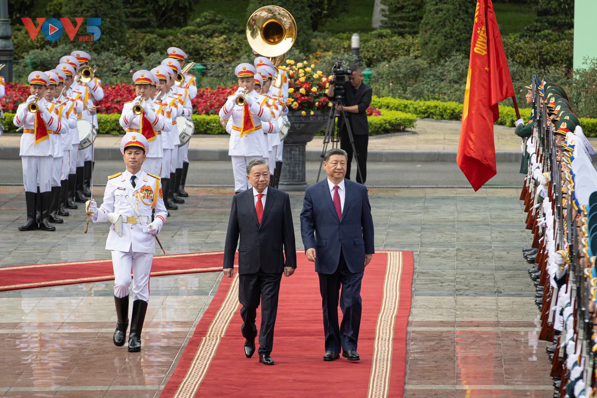 El desfile de vehículos que transportaba a Xi Jinping llegó a la sede de la Presidencia, donde fue recibido por niños y ciudadanos de la capital. A continuación, To Lam invitó al líder chino a subir al estrado de honor, mientras la banda militar interpretaba los himnos nacionales de ambos países y se dispararon 21 cañonazos en saludo al visitante desde la Ciudadela de Thang Long.