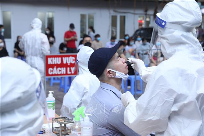 Sanitarios de Hanói toman muestras para la detección de infecciones por el virus SARS-CoV-2 en la comunidad. (Foto: VNA) |