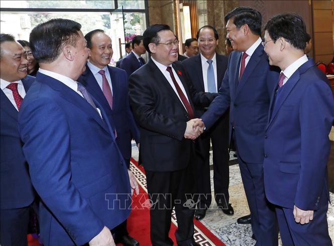 El presidente de la Asamblea Nacional Vuong Dinh Hue, en encuentro con dirigentes de Hanói... (Foto: VNA) |