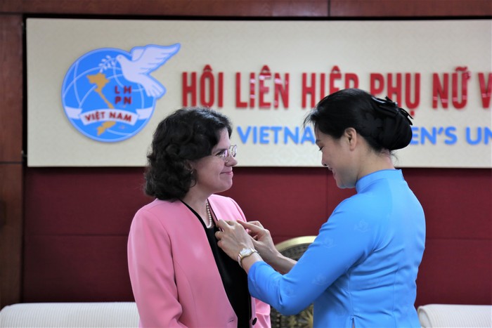 La presidenta de la Unión de Mujeres Vietnamitas, Ha Thi Nga, impone la distinción a la saliente embajadora de Cuba, Lianys Torres Rivera. (Foto: vwu.vn) |