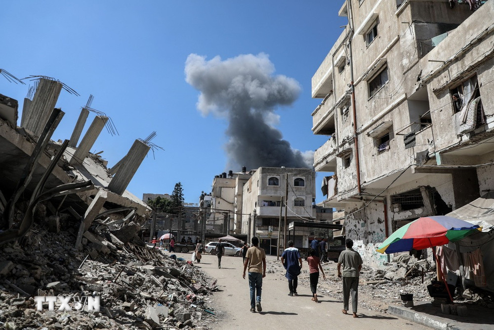 Humo se eleva tras un ataque aéreo israelí sobre la ciudad de Gaza, el 10 de septiembre de 2025. (Foto: Xinhua/VNA) |