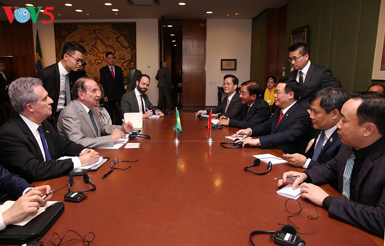 Mientras en la reunión con Aloysio Nunes Ferreira, ministro de Relaciones Exteriores, Vuong Dinh Hue destacó que Vietnam busca impulsar los nexos con Brasil a fin de vincularse más profundamente con el Mercado Común del Sur (Mercosur). Ambas partes convinieron en continuar elaborando estructuras jurídicas a favor de los lazos bilaterales tales como el acuerdo marco de cooperación técnica e intercambio de información arancelaria, de cara a la firma de un tratado de evitación de la doble imposición, entre otros pactos de diferentes sectores. También acordaron optimizar los mecanismos de colaboración suscritos para mejorar la coordinación binacional en las organizaciones y foros internacionales.