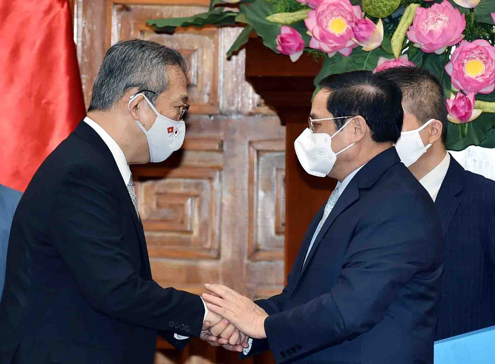 El primer ministro de Vietnam, Pham Minh Chinh (d) y el embajador de Japón en Hanói, Yamada Takio. (Foto: VGP) |