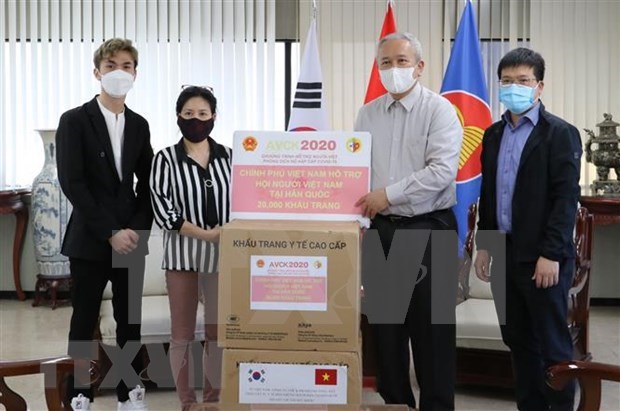 El embajador de Vietnam en Corea del Sur, Nguyen Vu Tu, entrega suministros sanitarios a representantes de la comunidad de connacionales residentes en ese pais |