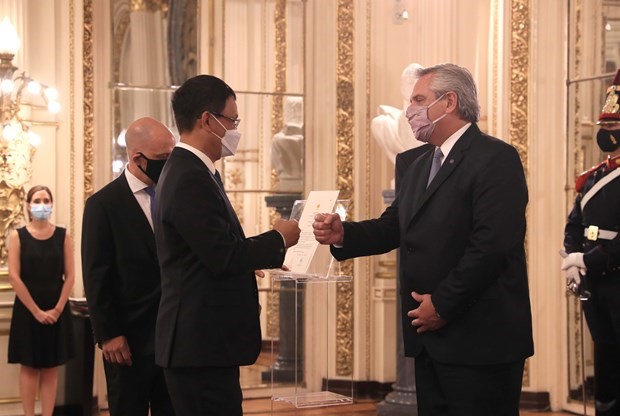 El nuevo embajador vietnamita en Buenos Aires, Duong Quoc Thanh, presenta las cartas credenciales al presidente argentino, Alberto Fernández (Foto: VNA) |