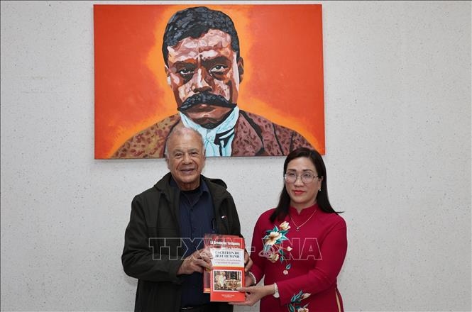 El secretario general del Partido del Trabajo de México, Alberto Anaya Gutiérrez, entrega a Dinh Thi Mai, vicejefa del Departamento de Propaganda, Educación y Movilización de Masas del Comité Central del Partido Comunista de Vietnam, varias publicaciones sobre Vietnam en español, editadas y distribuidas por el PT en América Latina. (Foto: VNA) |