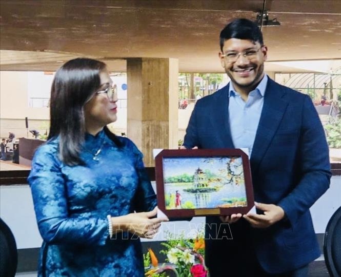 Dinh Thi Mai, entrega un obsequio a Rander Peña, vicepresidente de Asuntos Internacionales del Partido Socialista Unido de Venezuela. (Foto: VNA) |
