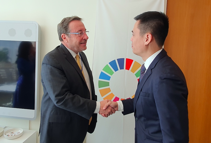 El embajador Dang Hoang Giang, jefe de la Misión Permanente de Vietnam ante la ONU (d) se reúne con el director general del PNUD, Achim Steiner. (Foto:VOV) |