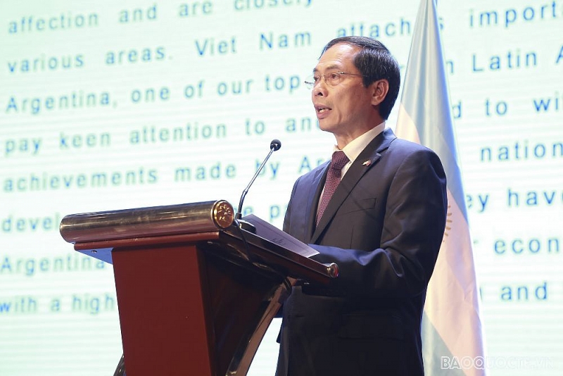 El encargado de negocios de Argentina en Vietnam, Luis Agustín Costas habla en el acto al que asiste el vicecanciller Bui Thanh Son. (Foto: baoquote.vn) |