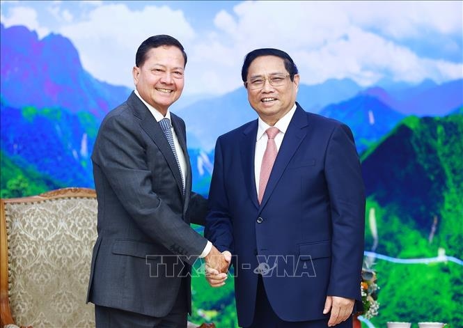 El primer ministro Pham Minh Chinh (d) y el viceprimer ministro de Camboya, Neth Savoeun. (Foto: VNA) |