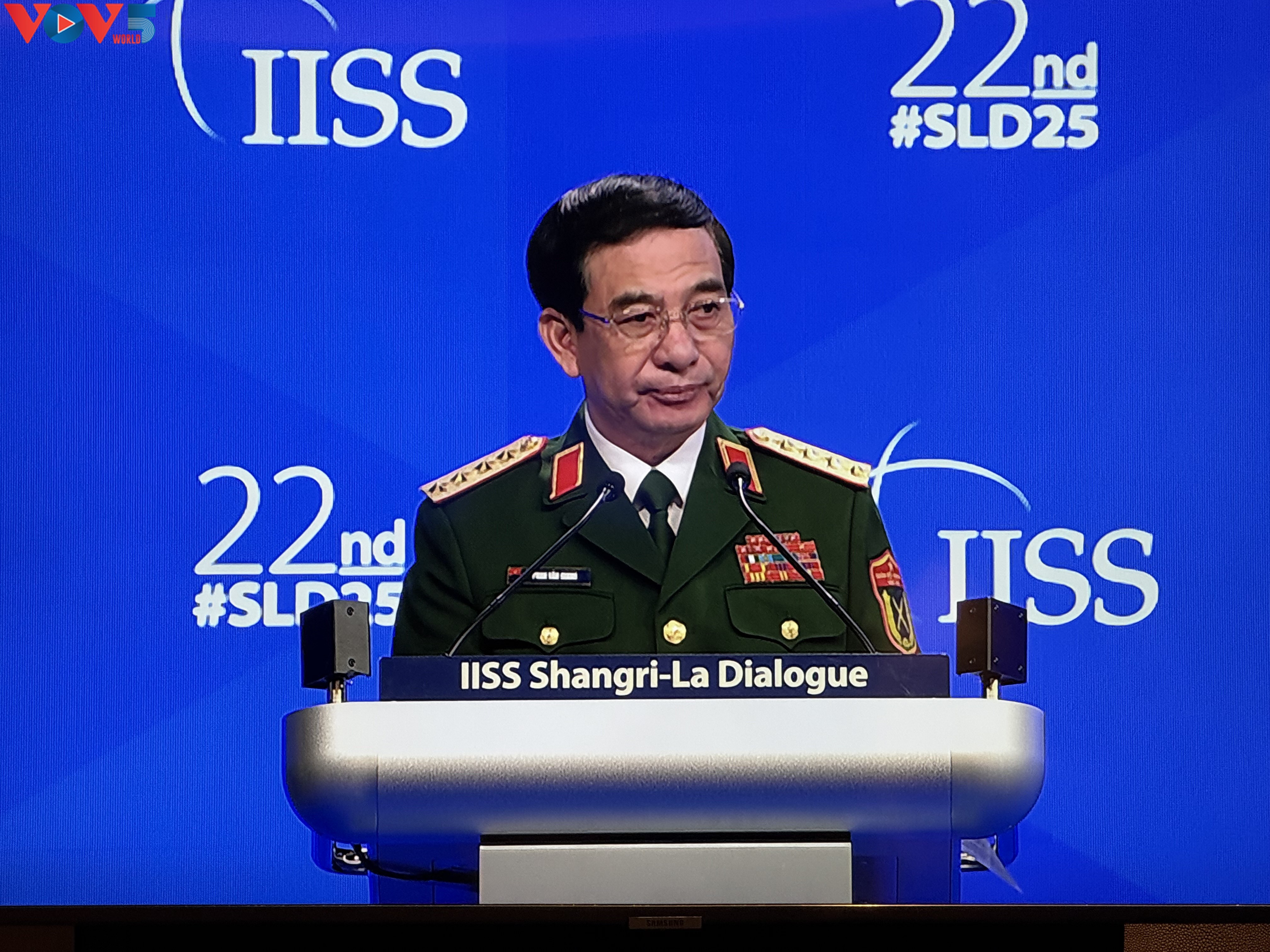 El ministro de Defensa, Phan Van Giang, durante su intervención en el Diálogo de Shangri-La 2025. (Foto: VOV) |