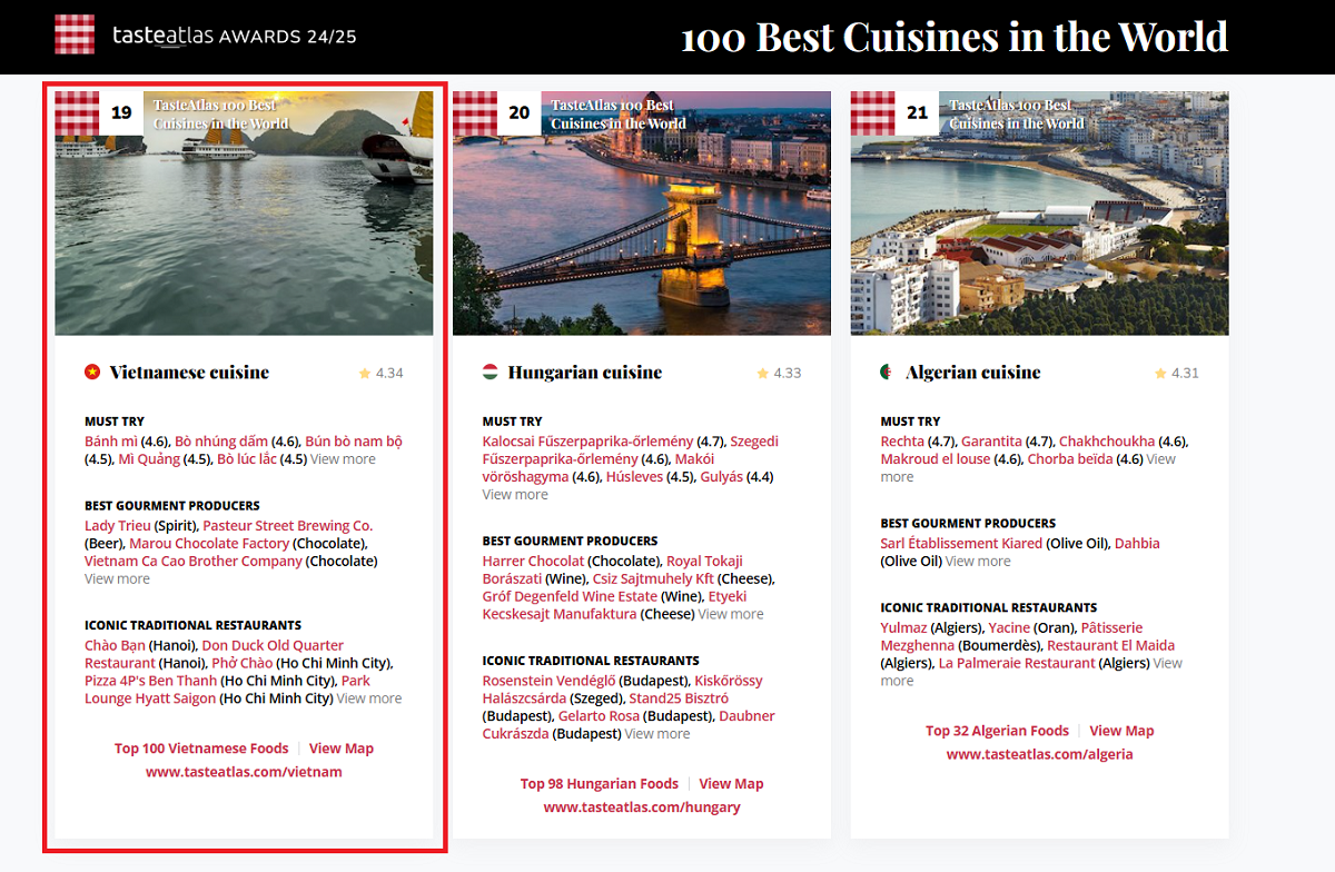 Vietnam ocupa el puesto el 19 de la lista de las 100 mejores cocinas del mundo de Taste Atlas en 2024. (Foto: Taste Atlas) |