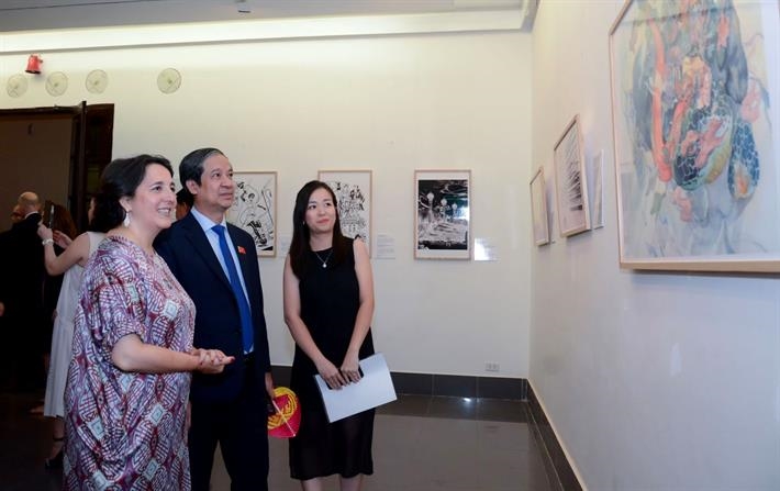 El ministro de Educación y Formación de Vietnam, Nguyen Kim Son, y la embajadora de España en Hanói, María del Pilar Méndez Jiménez, visitan la exposición "El mundo necesita mujeres superhéroes". (Foto: dangcongsan.vn) |