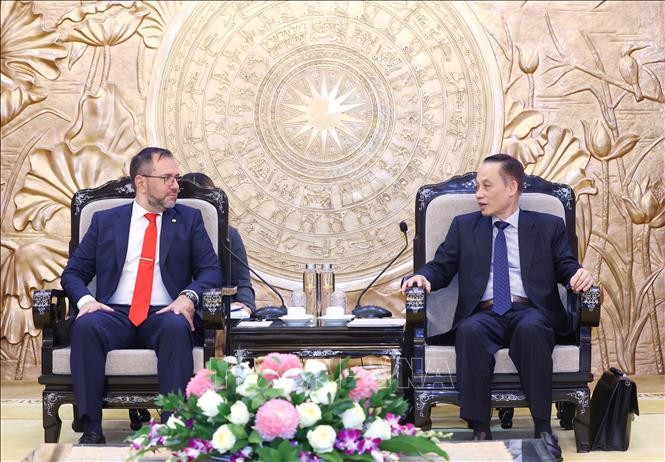 El jefe del Departamento de Relaciones Exteriores del Comité Central del Partido Comunista de Vietnam, Le Hoai Trung (d), en la reunión con el ministro del Poder Popular para Relaciones Exteriores de Venezuela, Yván Gil Pinto. (Foto: VNA) |