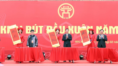 (VOVWORLD) - El presidente Vo Van Thuong, asistió este domingo por la mañana a la ceremonia de redacción del Año Nuevo celebrada en la Zona Memorial al Héroe Nacional Nguyen Trai, en el distrito de Thuong Tin, en las afueras de Hanói.