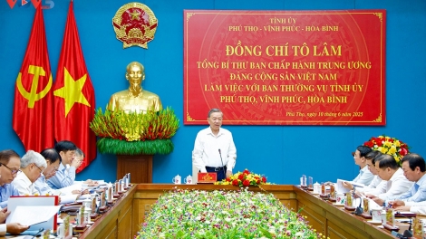 (VOVWORLD) - El secretario general del Partido Comunista de Vietnam (PCV), To Lam, presidió hoy en la ciudad de Viet Tri una sesión de trabajo con los miembros permanentes de los Comités Provinciales del Partido de Phu Tho, Vinh Phuc y Hoa Binh sobre la situación y los resultados de la implementación de las Resoluciones y Conclusiones del Comité Central de la organización política.