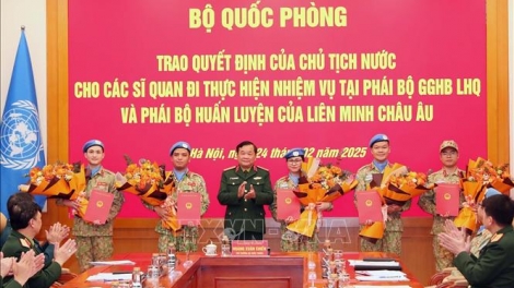 (VOVWORLD) - El Ministerio de Defensa de Vietnam celebró el 24 de febrero una ceremonia para presentar las decisiones del Presidente de la República a cinco oficiales que están a punto de partir hacia el exterior en las misiones de mantenimiento de la paz de las Naciones Unidas (ONU) y la Misión de Entrenamiento de la Unión Europea (EUTM).