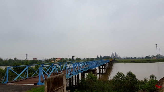 El antiguo puente Hien Luong, sobre el río Ben Hai; al fondo el Monumento a la Aspiración a la Reunificación. |