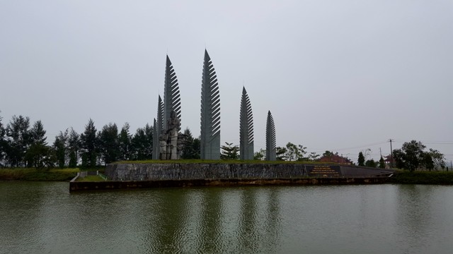 Monumento de la Aspiración a la Reunificación, situado en lado sur del río Ben Hai. El conjunto muestra seis penachos de cocoteros, árbol típico del sur de Vietnam. En el centro las figuras de una madre y su niña miran al norte, en espera de la reunificación. |