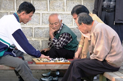 Jugar el ajedrez chino en las aceras en un encuentro de
