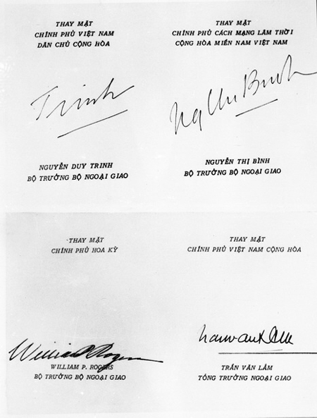 El concluyente pliego rubricado establecía el fin de las hostilidades y de la intervención militar estadounidense con la evacuación de sus tropas e intercambios de prisioneros, el reconocimiento al derecho de autodeterminación de los vietnamitas y a la reunificación nacional, y el respeto a la neutralidad de Laos y Cambodia.