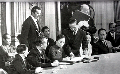Los 34 gigantes voladores derribados resultaron suficientes para que Richard Nixon y Henry Kissinger recordaran que en París existía una mesa de negociaciones donde los esperaba Le Duc Tho y Nguyen Thi Binh (en la foto firmando el documento) para oficializar el nuevo fracaso del imperio en la milenaria Indochina.