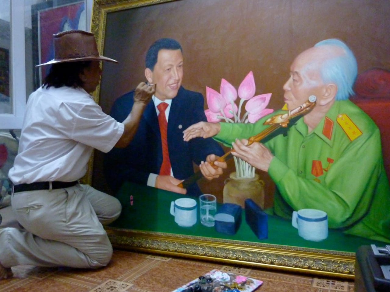 El artista Le Dinh Quy reproduce en gran formato el histórico encuentro del expresidente de Venezuela Hugo Chávez con el General Vo Nguyen Giap, el 1 de agosto de 2006 en Hanói. El óleo forma parte de la galería de la Embajada de la República Bolivariana de Venezuela en Vietnam. (Foto suministrado por el autor) |
