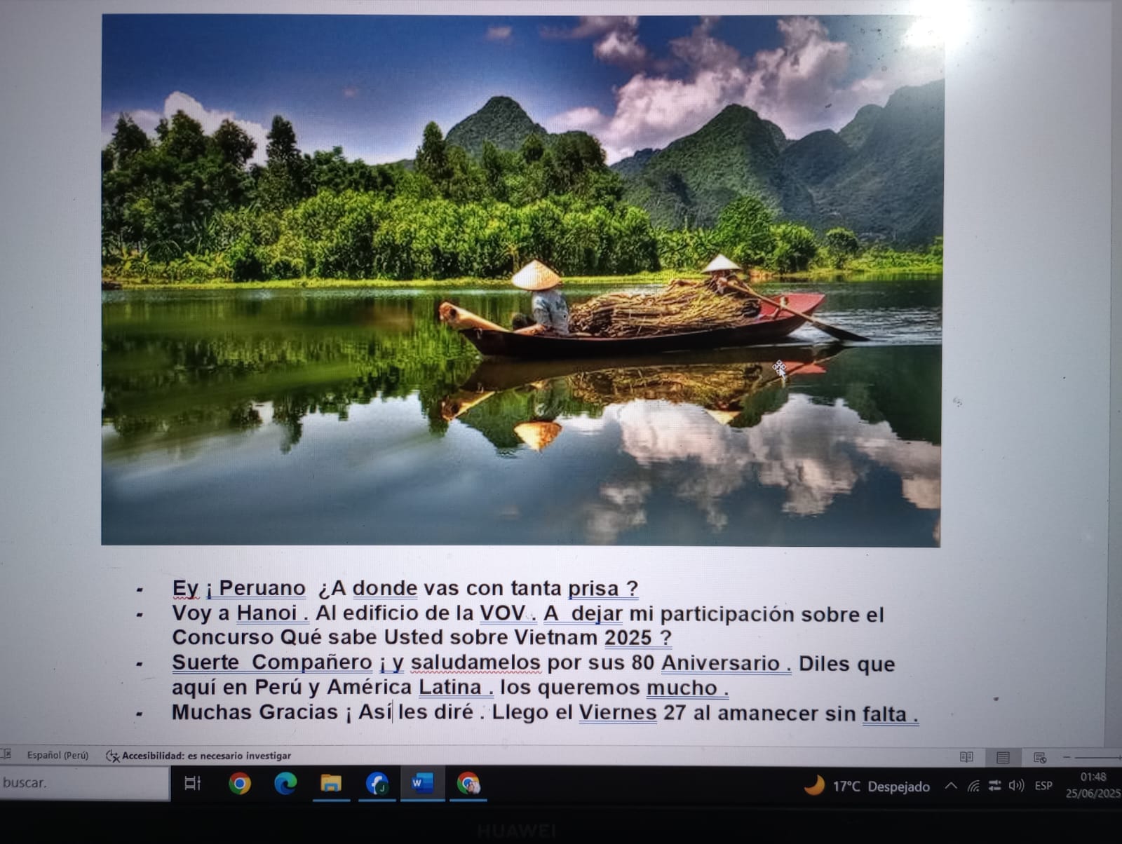 A todos ustedes: ¡nuestro más sincero agradecimiento! Su participación y sus mensajes son una muestra del afecto genuino hacia La Voz de Vietnam y nuestro país. Gracias a su entusiasmo, el concurso de este año será un éxito. Y además, han contribuido a las actividades conmemorativas por el 80.º aniversario de la fundación de VOV y del Departamento de Emisiones al Exterior, VOV5. Muy pronto anunciaremos los resultados. ¡Y ojalá que alguno de nuestros seguidores del programa en español obtenga un premio destacado! ¡Crucemos los dedos!