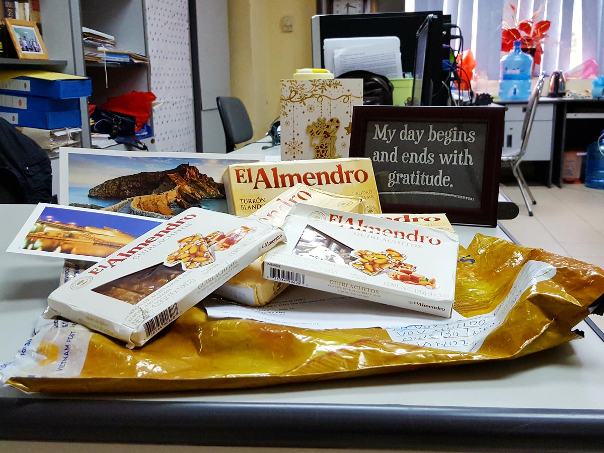 Amables oyentes, aunque faltan dos semanas para la Navidad, en los últimos días hemos recibido mensajes y tarjetas de felicitación de numerosos amigos, entre ellos, Salvador Lavín Carral, de Cantabria, España; Roberto Carlos Álvarez Galloso, de Miami, Estados Unidos, y Osvaldo Gómez González, de la central provincia de Villa Clara, Cuba. La Voz de Vietnam agradece mucho a estos radioescuchas por su cariño hacia nuestra programación en castellano, especialmente a José Ignacio Coz Lezama, de Bilbao, España, quien nos envió un paquete de regalos de Navidad típicos del país ibérico. Los turrones y mazapanes de almendra serán fantásticos para una fiesta navideña en nuestro lugar de trabajo a la cual invitaremos también a los compañeros de otras secciones a disfrutar estas especialidades de su país.