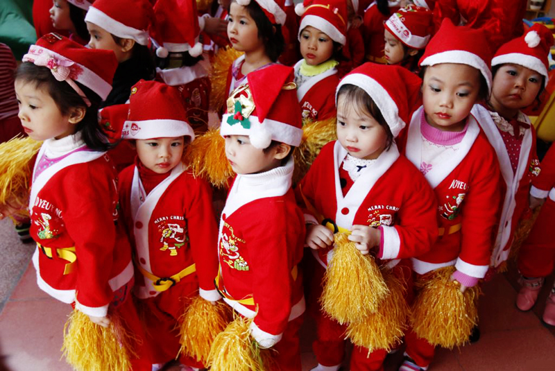 Niños vietnamitas preparan una actuación artística en saludo a la Navidad 2014